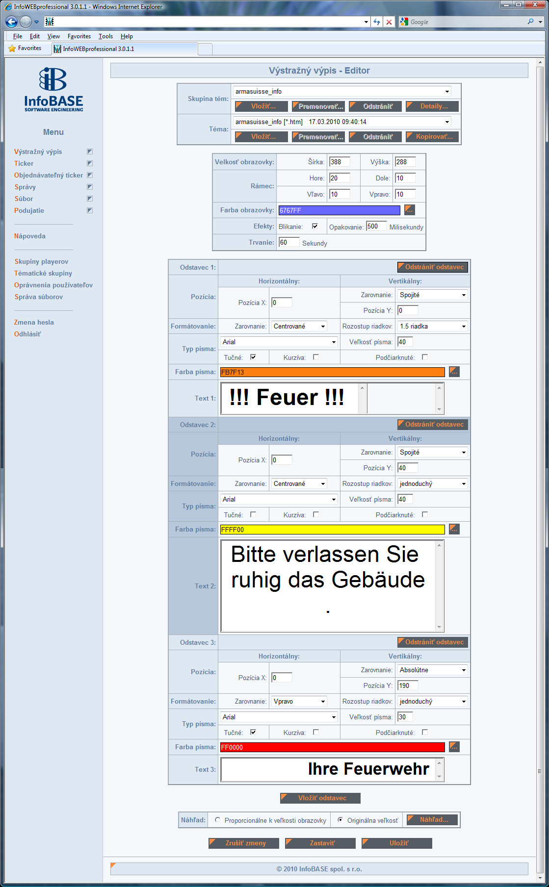 Pri zadávaní výstražného textu musí byť definovaná dľžka zobrazenia (v sekundách).
